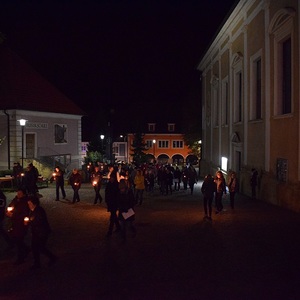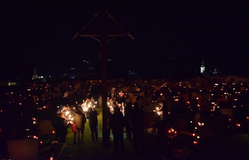 Am Friedhof angekommen gab es noch eine Station beim Kreuz. Die Kulisse war wie immer außergewöhnlich - der Friedhof mit Kerzen überseht und wir zwischendrin.