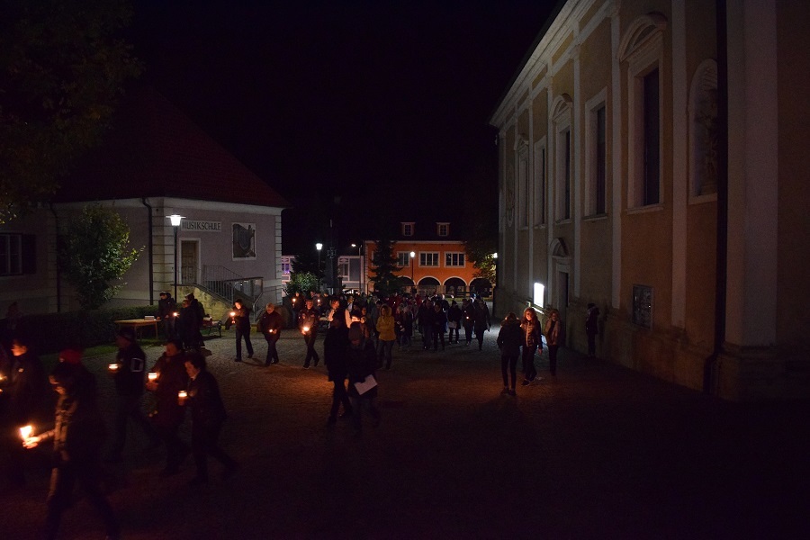 Am 1. November war es um 19 Uhr wieder so weit. Alle anwesenden Pfarrbewohner hatten Kerzen oder Laternen in der Hand. Unsere Chorleiterin hatte auch schon ihre Gitarre in der Hand und unser Kaplan war auch so weit. Und schon ging es los...ein steiler Aufstieg zum Friedhof.