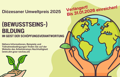 (BEWUSSTSEINS-)BILDUNG im Geist der SchöpfungsverantwortungMachen Sie mit beim Diözesanen Umweltpreis 2025 der Diözese Graz-Seckau! Gesucht sind Veranstaltungen und Initiativen, bei denen...