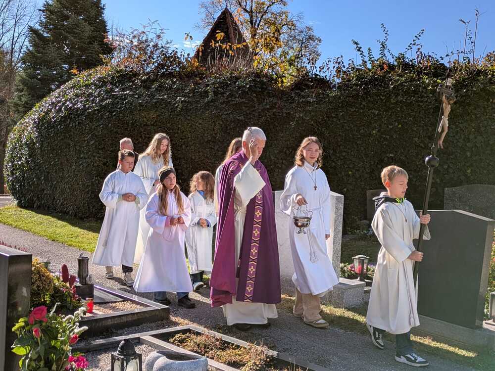 Anschließend begleiteten die Ministranten den Priester bei strahlendem Sonnenschein am Friedhof in Peggau bei der Gräbersegnung, zu der viele Angehörige gekommen waren.