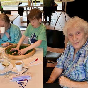 Frau Michaela Moser und Frau Susanne Schreiner überraschten die anwesenden Senioren heute mit dem Besuch einiger Kinder aus der Nachmittagsbetreuung. Der Raum war gefüllt mit lebendiger und fröhlicher Stimmung. Beim gemeinsamen Spielen mit Jung und Alt wurde viel geplaudert und gelacht. Die Kuchenteller leerten sich rasch und bei Kaffee, Wein und gesponserten Säften, waren alle Gäste bestens versorgt.