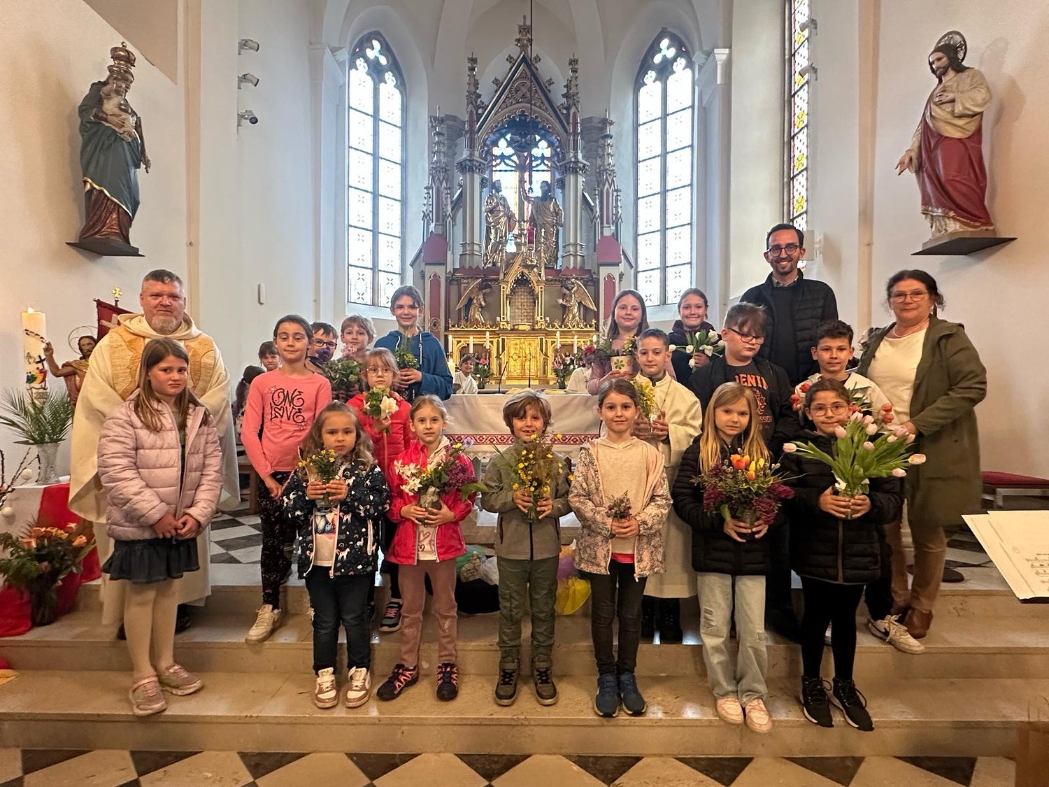 Die Em­maus­wan­der­ung fiel zwar ins Was­ser, aber das tat der Stim­mung beim Oster­gottes­dienst der VS-Gamlitz kei­nen Ab­bruch. Stell­ver­tre­tend für die Klas­sen brach­ten ei­ni­ge Kin­der bun­te Blu­men zum Al­tar. So wie im Früh­ling das neue Le­ben in der Na­tur er­wacht, so dür­fen wir das neue Le­ben un­se­res Herrn Jesus fei­ern.