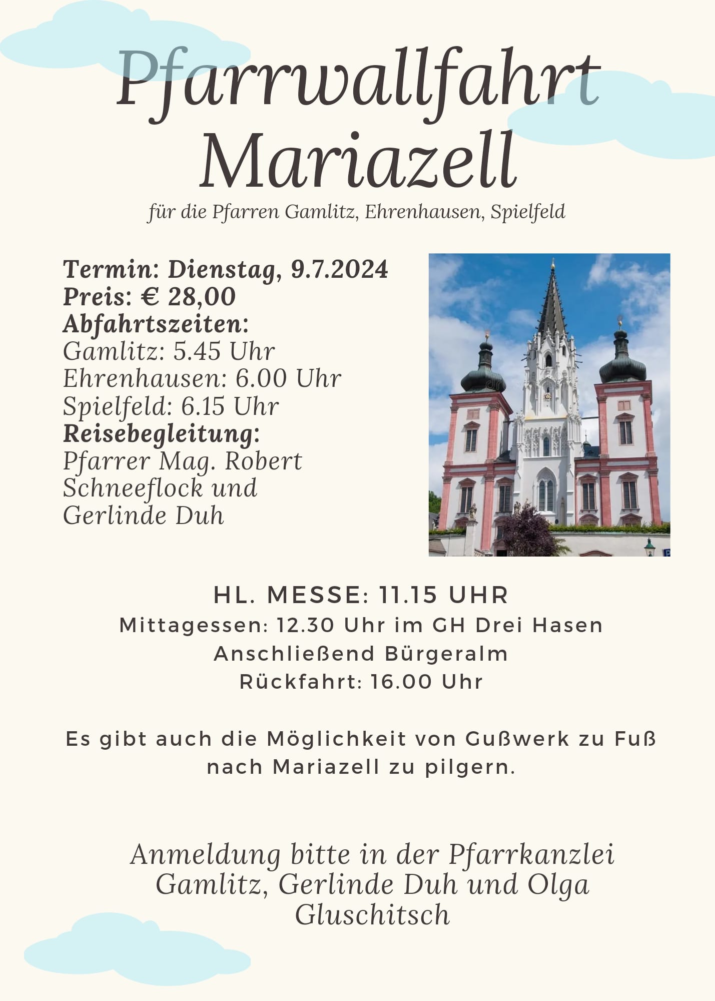 Wir freuen uns - ab sofort- auf Eure Anmeldung! Mariazell ist der bedeutendste Wallfahrtsort in Österreich und wird von unzähligen Menschen, aus verschiedensten Gründen, immer wieder gerne besucht. Auch in unserem Pfarrverband wird wieder eine gemeinsame Wallfahrt organisiert. Nähere Details findest du am Flugblatt.