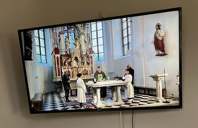 Der Pfarr­ge­mein­de­rat hat sich im Jahr 2024 in­ten­siv mit den Chan­cen der Di­gi­ta­li­sier­ung für die Pfarr­kirche be­schäf­tigt sich dazu ent­schlos­sen, regel­mä­ßig Heil­ige Mes­sen on­line als Video­stream an­zu­bie­ten. Wir ha­ben dabei be­son­ders an eine Über­tragung ins Pflege­heim - aber auch an eine Über­tra­gung in nahe und ent­fern­te Haus­hal­te, für Per­so­nen die nicht zur Hei­ligen Mes­se kom­men kön­nen, ge­dacht.