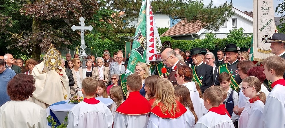 Im Anschluss an die Hl. Messe, zelebriert von Vikar Gerhard Hatzmann und begleitet von Kantorin, Lektoren und liturgischen Diensten beider Pfarren, fand eine Andacht bei den vier Stationen am Dorfplatz statt. Für die kleine Prozession waren vier Brottische als Altäre gerichtet, als Sinnbild für die vier Himmelsrichtungen und dafür, dass Christus der Heiland der ganzen Welt ist. Im gemeinsamen Liedruf "Brot des Lebens" zogen die liturgischen Dienste und die Kinder stellvertretend für das Volk Gottes zu den vier Altären: Brot der Liebe – Brot der Versöhnung – Brot des Friedens – Brot der Hoffnung. Zum Abschluss erteilte Vikar Hatzmann den Eucharistischen Segen, verbunden mit der Einladung, das Allerheiligste gemeinsam zur Kirche zu begleiten. Die Feier schloss mit dem gemeinsam gesungenen "Te Deum" ab. Zu den Feierlichkeiten waren auch die Vereine wie Feuerwehr und ÖKB eingeladen.