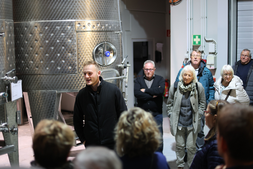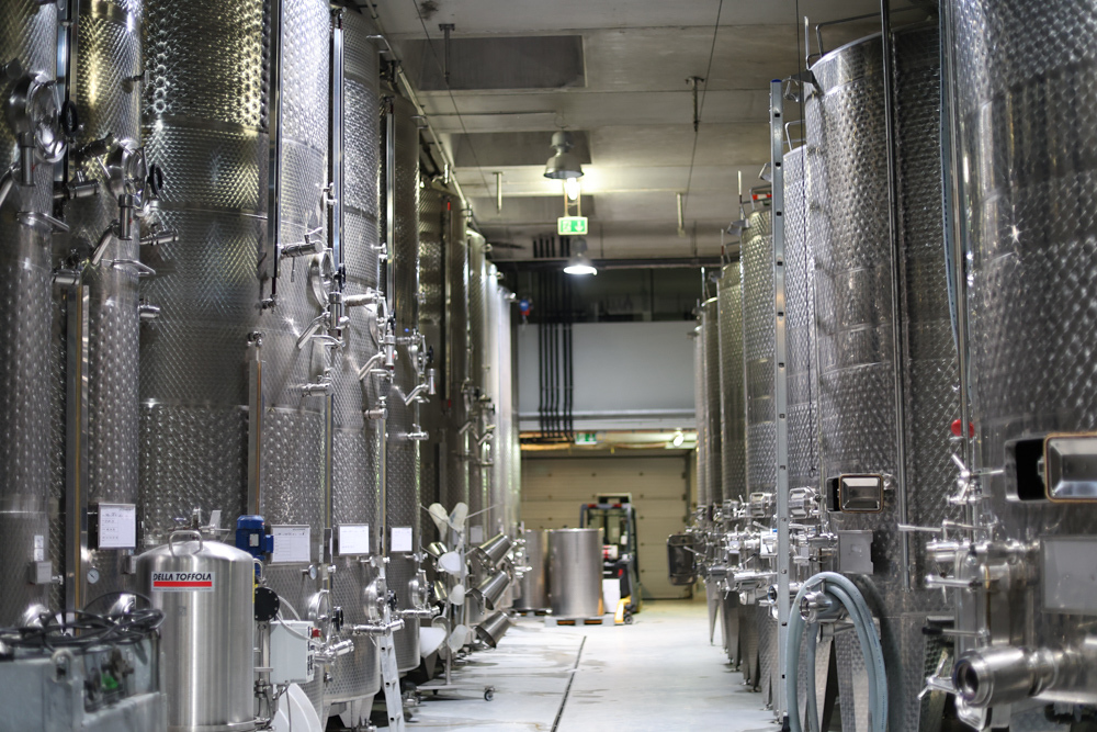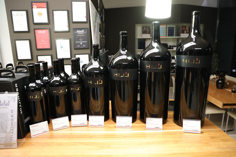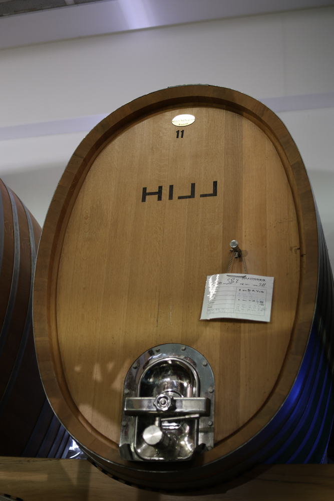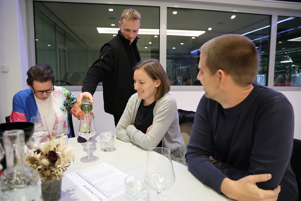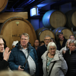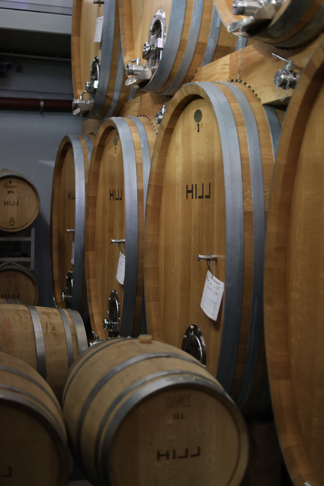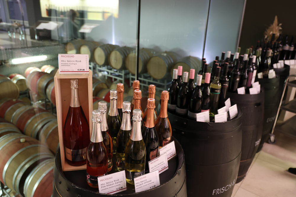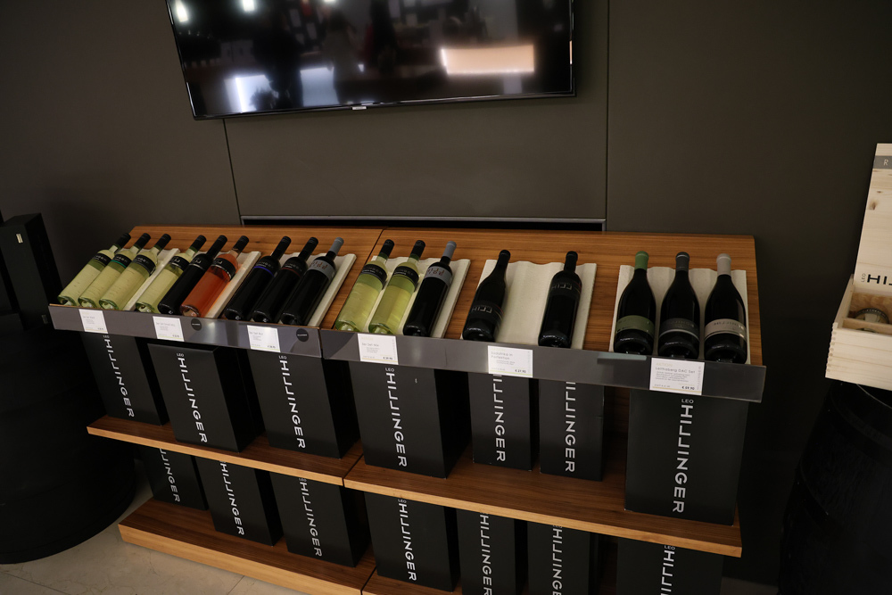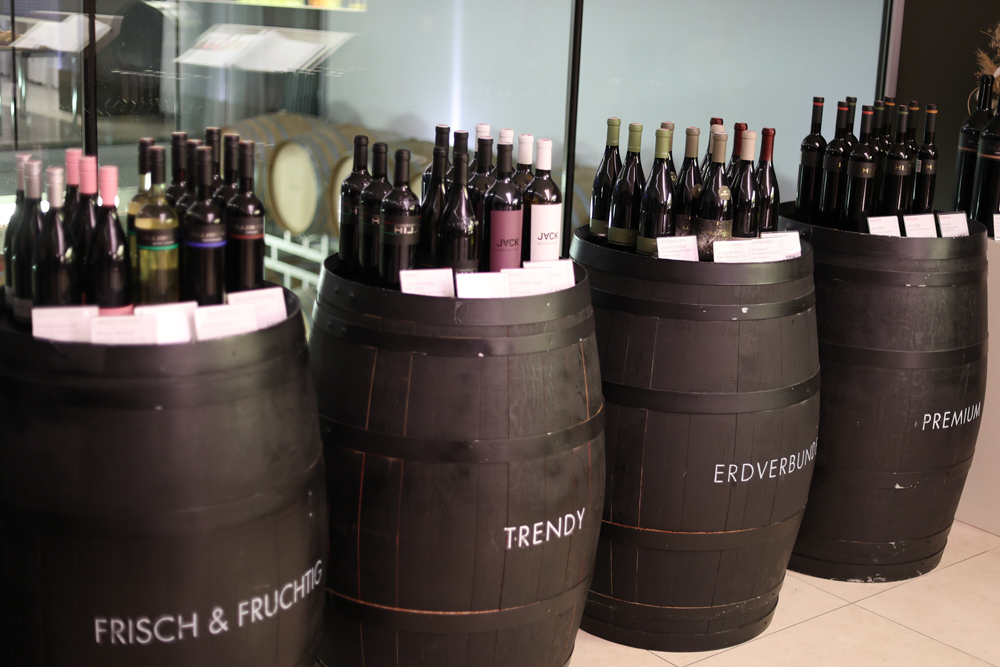 Zum krönenden Abschluss fuhren wir weiter nach Jois im Burgenland zum Weingut Leo Hillinger. Zuerst wurden wir durch den Weinkeller geführt. Zwischen Stahltanks und Barriquefässern konnten wir alle möglichen Fragen zum Wein und Weingut stellen. Im Gebäude darüber konnten wir mit Blick auf den Weinkeller vier Weine verkosten. Zur Stärkung durfte eine Jause dazu nicht fehlen.
